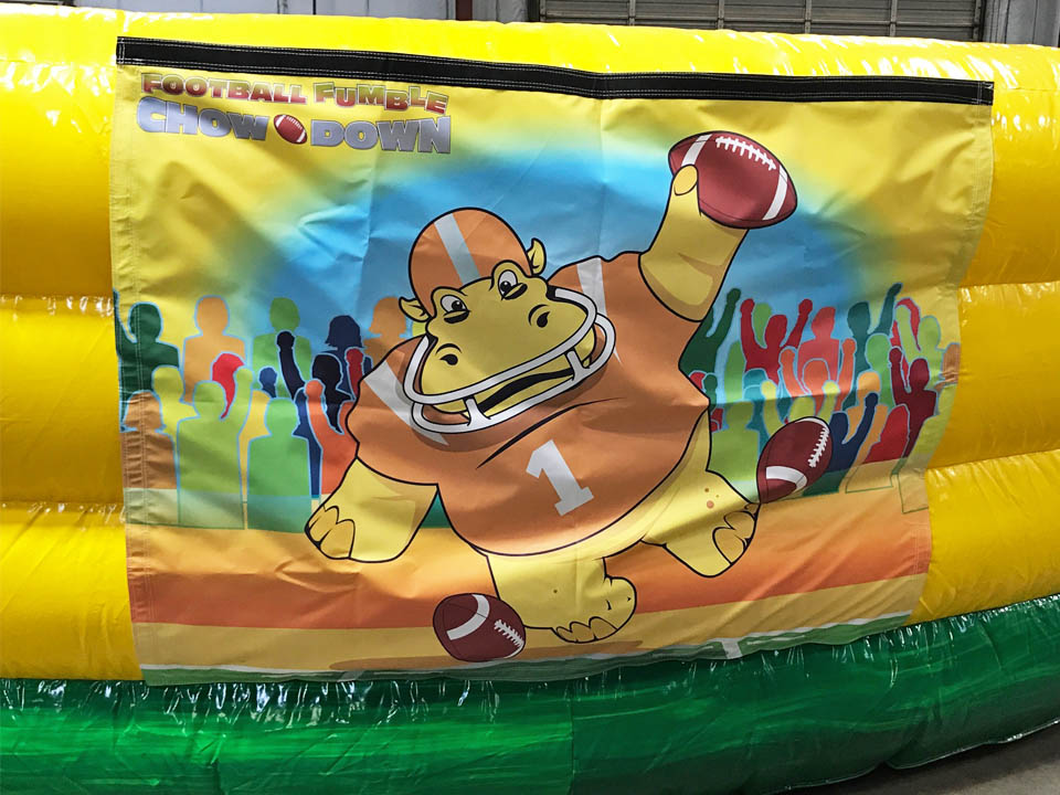 Football Fumble Chow Down (or Hippo Chow Down) is the latest interactive game guaranteed to keep your participants and spectators laughing for hours. This is the latest 4-player bungee tug-o-war style game that involves speed, strength and agility. Perfect for the youngest participants too, bungee cords can be extended by adding on a 2′ extension. Object of the game: Each of the 4 players starts with their back to the wall and races to the pond of balls in the center of the game to retrieve a ball and aand return it to the mesh bag at their starting wall. They will repeat this until all 50 balls are collected into teh mesh bags. Once all of the balls are chow’d down, the player with the most balls in their bag is the winner.