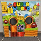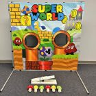 Think you have the super skills to take on Super World? This fun, brightly colored game is a Super Mario Fan’s dream! The backdrop features a video game scene with hills, pipes and a castle along with coins, super blocks, a koopa turtle, a piranha plant and even goombas! Players will attempt to launch the super mushrooms into one of the two pipes with a stomp launcher. Game includes (1) stomp launcher and (6) super mushrooms.