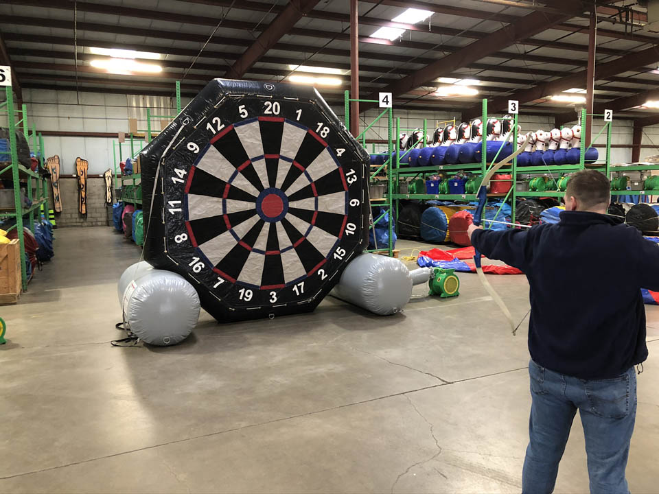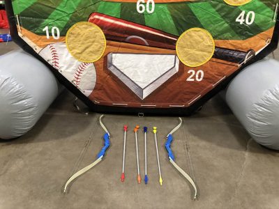 No matter what you call it, this inflatable game is sure to be a crowd-pleaser! A must have for any sporting event, field day or school fundraiser. This 10′ version is two-sided, one side shows a Dart Board and the other shows a Baseball Stadium. Rental includes your choice of :