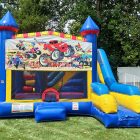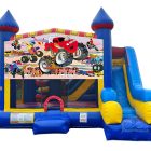 The Monster Truck Castle Combo features a bounce house, climbing wall, slide, obstacles and two basketball hoops! It is sure to provide endless hours of fun! It can be rented plain, or with the Monster Truck panel, as shown in the picture. All panel options include: