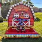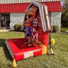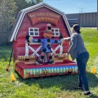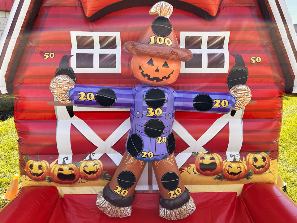 Players take turns tossing soft balls at the colorful inflatable scarecrow, aiming for high-score targets on its arms, legs, and body. We recommend players stand 5 ft. away and use an underhand throw.Β With its farm-themed backdrop, pumpkin patch details, and interactive scoring design, this inflatable game keeps guests of all ages entertained while adding a bright autumn vibe to your setup.