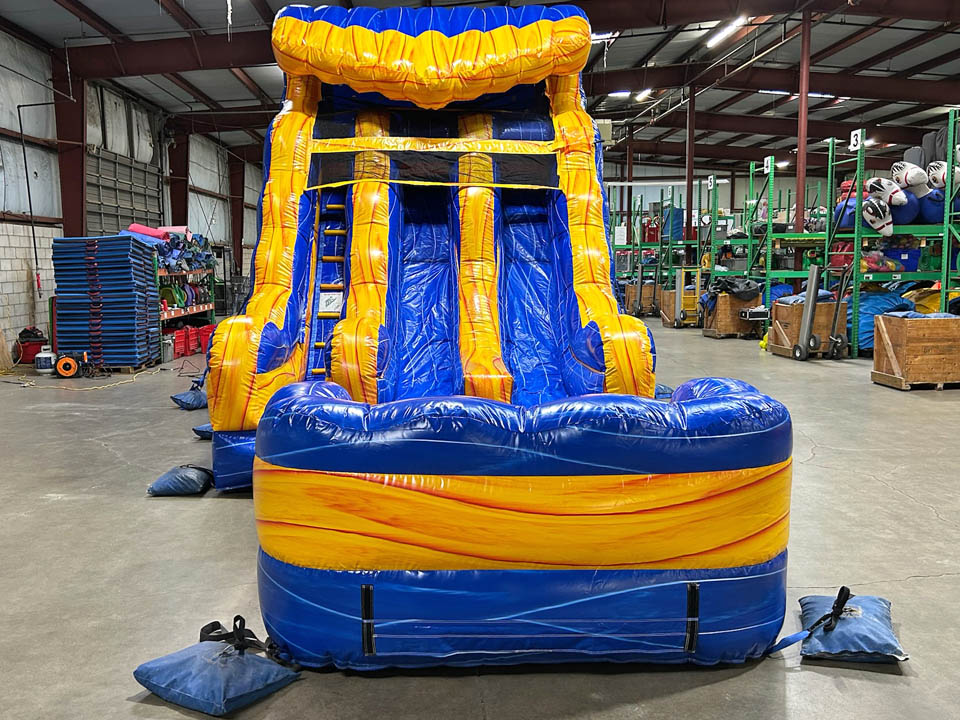 Looking for a dual lane water slide that will keep the kids, teens and adults entertained all day?! Look no further than our brand new sunset splash dual lane water slide! At 15′ tall, this slide is great for all ages and event types! Splash from sun-up to sunset in this eye-catching, brightly colored slide! This can also be used as a dry slide.
