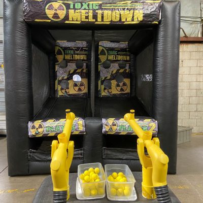 CAUTION! Decked out in yellow, black and “slime” green this fun, unique 35′ obstacle course has two competitors go head to head to the finish line. In front of them stands an enormous course of obstacles, including: jump through, a log jam, ramps, climbing walls, and a slide. Great for all ages. Can be extended to 60′ or 95′!